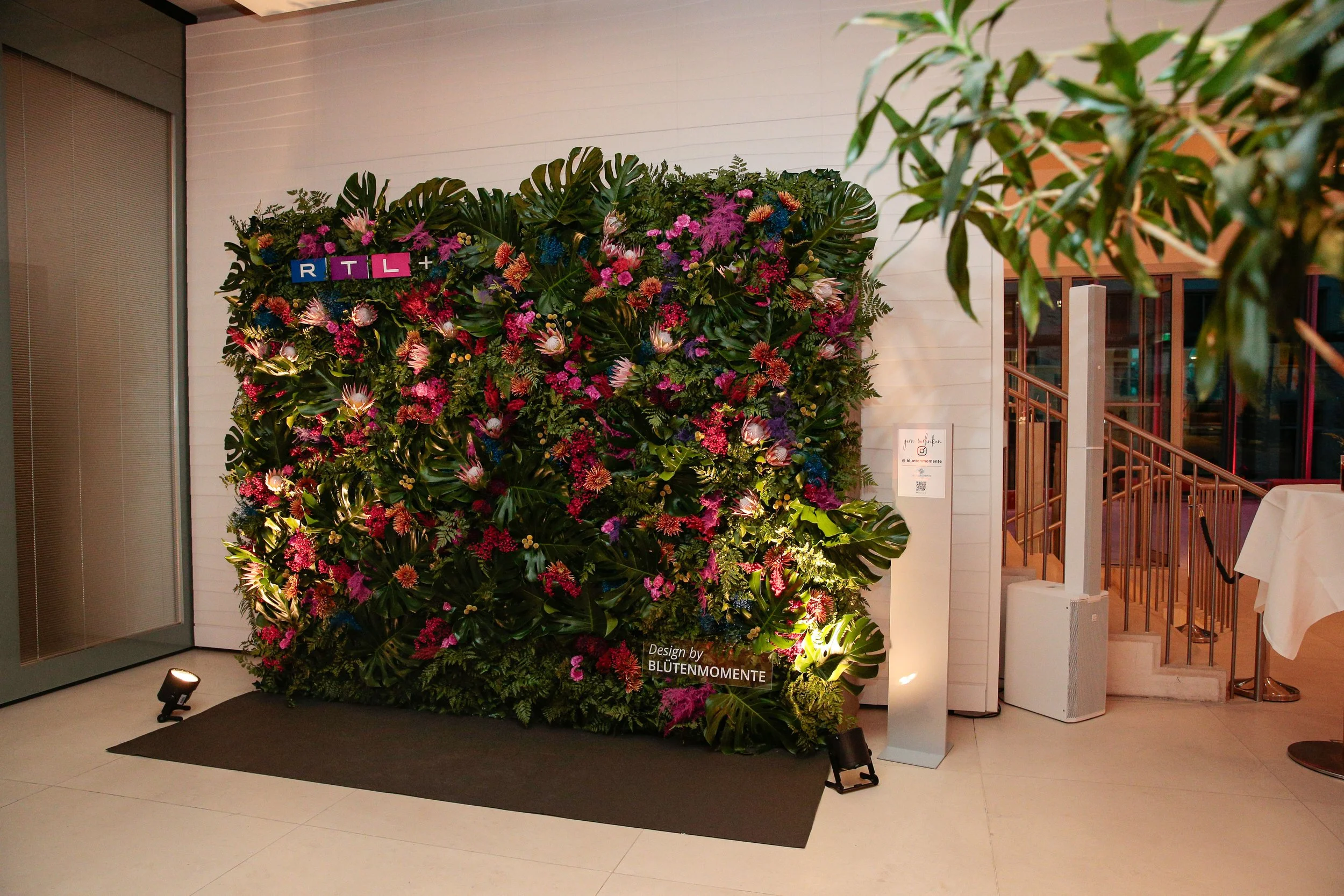Location: Bertelsmann Repräsentanz |Kunde RTL Plus Eventdeko für Branchen-Event und Talent Get Together | Blumenwand/Fotowand 300x240cm & Tischdeko