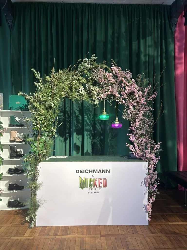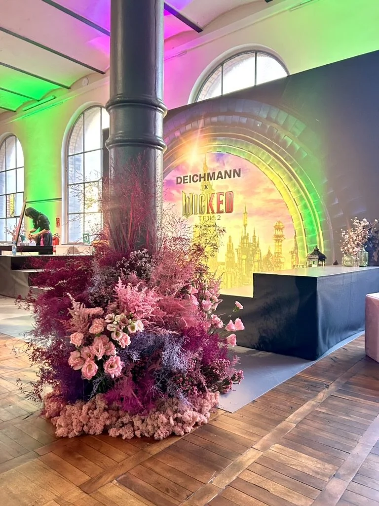Heeresbäckerei Berlin: Für Deichmanns „Wicked“-Promotion setzten wir ein Influencer-Event mit floraler Raumdekoration um – ein Blumenbogen als Fotospot, ergänzende Bodendekorationen und eine aufwendige Inszenierung mit rosanem Moos, vor Ort passgenau in den gewünschten Farben aufgebaut. Perfekt für starke Bilder, Social Content und ein stimmiges Ambiente.