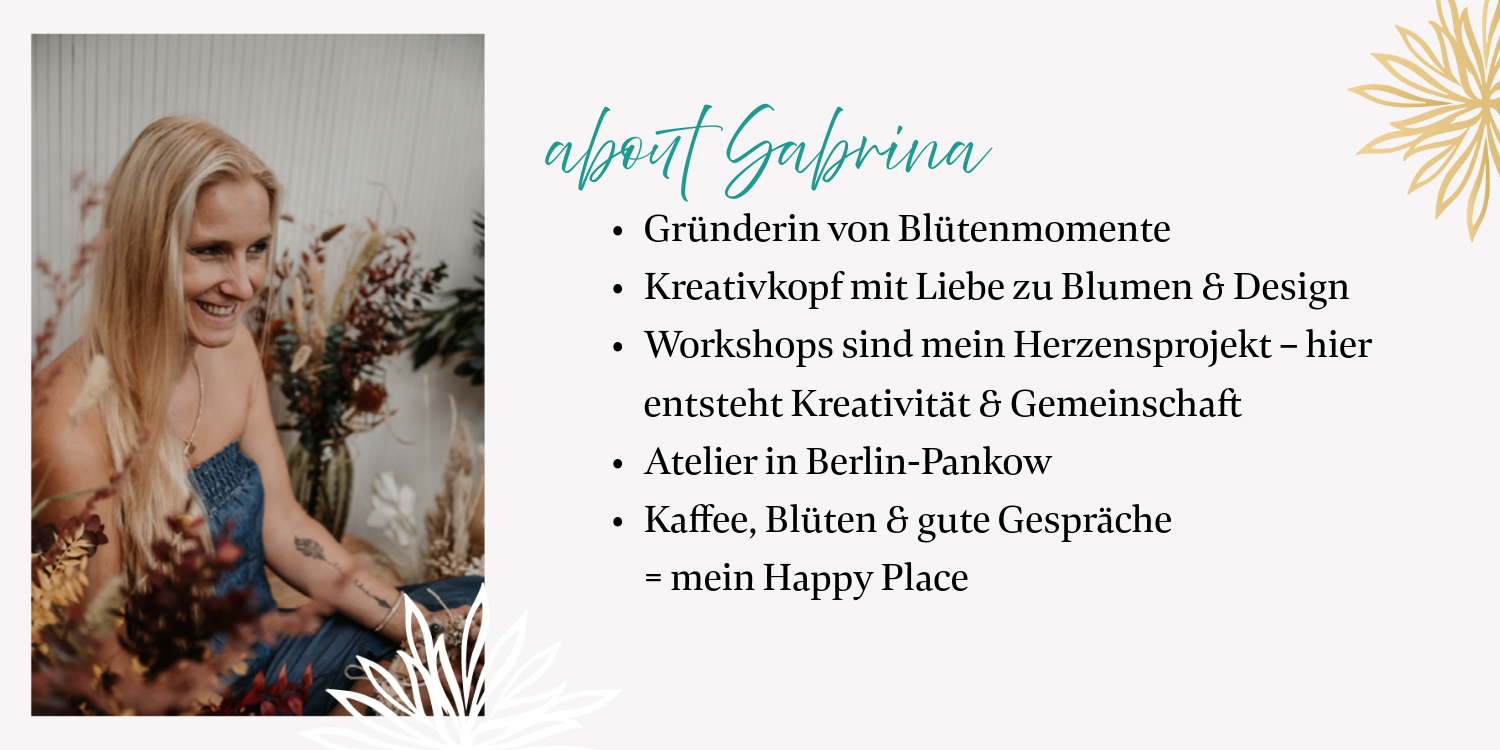 Sabrina von Blütenmomente – kreative Floristin und Gründerin aus Berlin-Pankow, spezialisiert auf DIY Workshops wie Blumenkranz, Trockenblumen- und Kerzen-Workshops